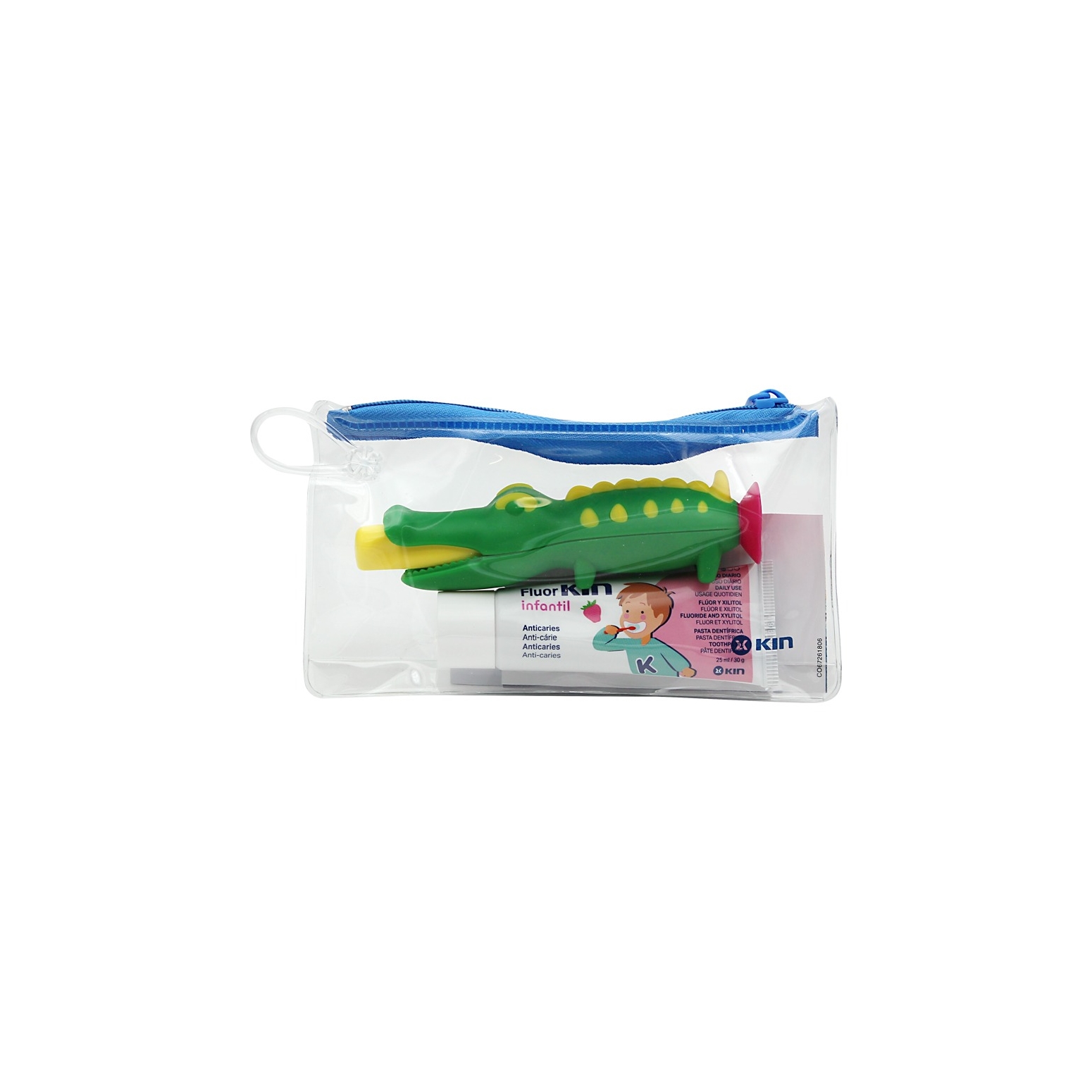 Cepillo dental con un atractivo diseño en forma de coche o cocodrilo en diferentes colores, hace más divertido el cepillado. Incluye, dentro de un práctico neceser, el dentífrico FluorKIN Infantil sabor fresa que protege contra la caries y refuerza el esmalte.